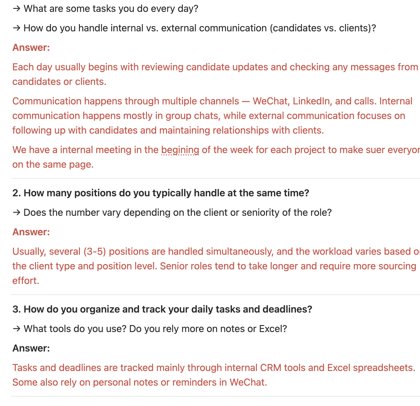 The interviews were structured around several key sections designed to provide a detailed understanding of users' experiences in the progress of finding the best fit candidate.
